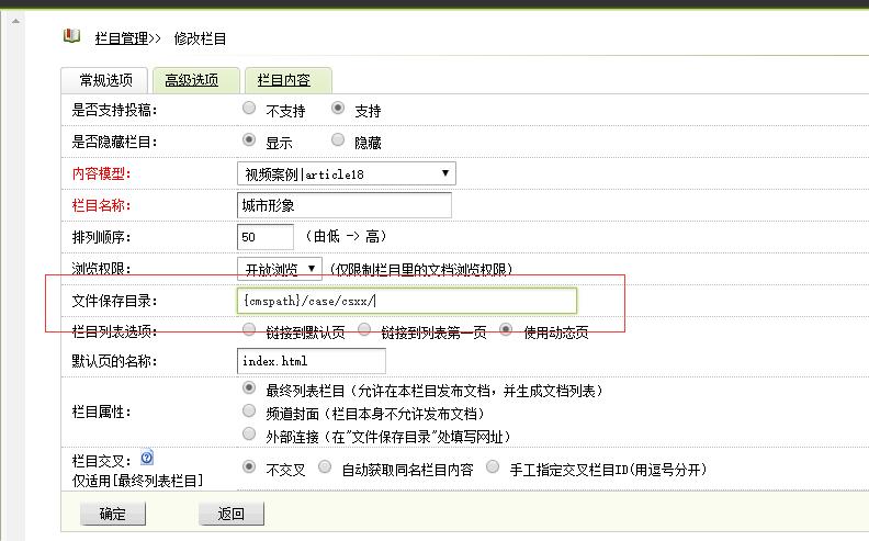 仔细把两个栏目一对比.发现出现问题的栏目文件保存目录最后面多了一个/,把最后这个斜杠去掉,保存,页面访问正常.