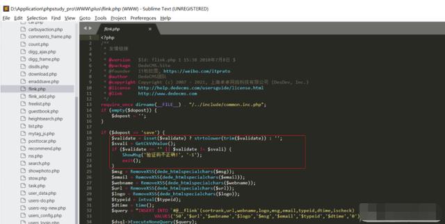 漏洞入口位于plus/flink.php文件中,在该文件中如果我们传入的dopost值为save且未传递验证码时,紧接着会去调用ShowMsg函数: