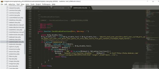 之后调用CheckDisabledFunctions函数进行检查操作,该函数主要用于检查是否存在被禁止的函数,然后通过token_get_all_nl函数获取输入,然而处理时并没有过滤双引号,存在被绕过的风险,攻击者可以通过将恶意PHP写到临时文件,之后在Display函数处通过include $tpl->CacheFile()将恶意临时文件包含进来从而实现远程代码执行: