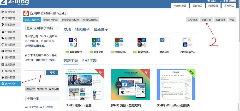 作者:本站作者 人气:首先,进入zblog后台,zblog后台地址是你的网站目录/zb_system/admin/index.php,登录就可以进入后台了,进入后台后,点击左侧的应用中心-新建主题,如下图一和下图二