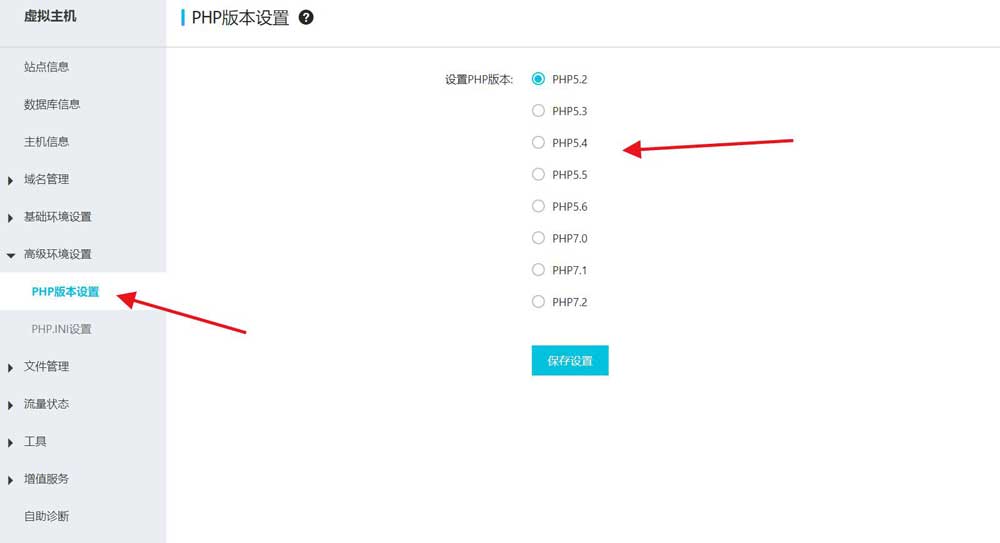 打开虚拟主机,登录虚拟主机控制面板,以阿里云为例,选择高级环境设置-php版本设置,然后点击右侧的相应版本,保存设置即可,如下图二。