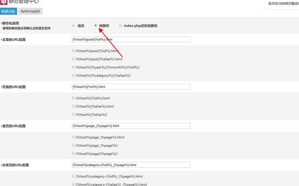 点击进入静态化配置中心后,选择“伪静态”按钮,可以看到如图二所示,每一项有很多小按钮列表,这个表示伪静态的形式,比如文章的url配置那一项{%host%}post/{%id%}.html,其中的host表示域名post为目录,id就是文章编号,那么翻译过来就是域名/post/id.html,其他项配置大同小异。