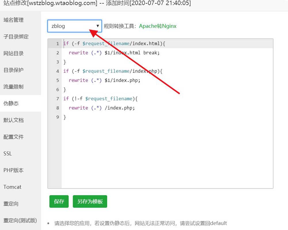 以腾讯云服务器为例,打开某一个需要设置的网站,点击网站右边的设置按钮,在弹出的窗口上点击伪静态按钮,然后如下图三红色箭头所示选择zblog,然后规则默认就添加到服务器上了,保存即可。
