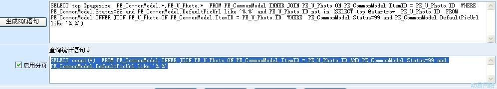 SELECT top @pagesize PE_CommonModel.*,PE_U_Photo.* FROM PE_CommonModel INNER JOIN PE_U_Photo ON PE_CommonModel.ItemID = PE_U_Photo.ID WHERE PE_CommonModel.Status=99 and PE_CommonModel.DefaultPicUrl like '%.%' and PE_U_Photo.ID not in (SELECT top @startrow PE_U_Photo.ID FROM PE_CommonModel INNER JOIN PE_U_Photo ON PE_CommonModel.ItemID = PE_U_Photo.ID WHERE PE_CommonModel.Status=99 and PE_CommonModel.DefaultPicUrl like '%.%')