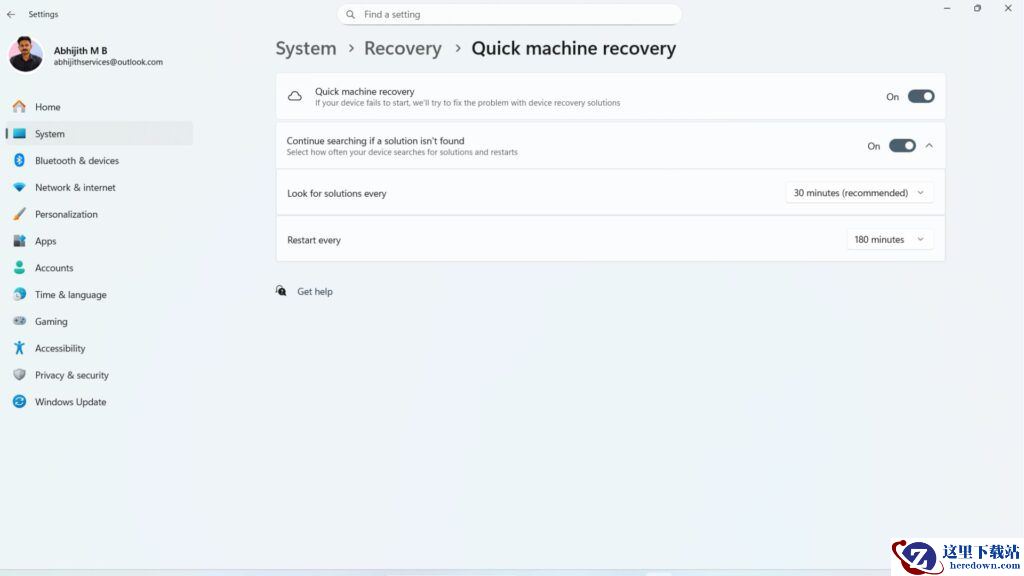 打开设置 > 系统。滚动并点击“恢复”选项。选择“快速机器恢复”,然后启用它。启用“继续搜索解决方案”选项,以获得 QMR 的全部功能。自定义“每多久查找一次解决方案”的时间限制。选择“每多久重启一次”的时间。如何测试快速机器恢复: