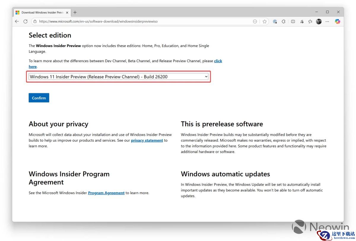 2.选择“ Windows 11 Insider Preview(发布预览频道)—Build 26200 ”。点击确认。