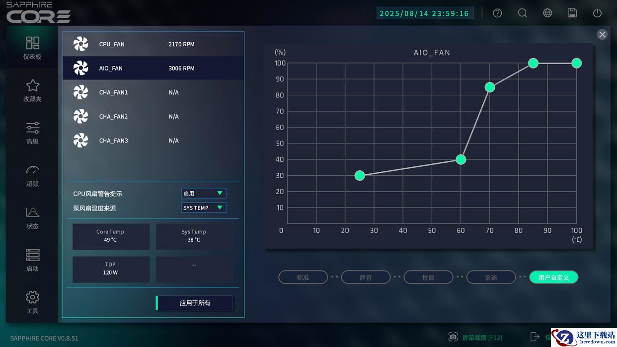 在仪表板那里点风扇设置就可以进入风扇转速曲线页面,BIOS已经提供标准、静音、性能和全速四种模式,新手可以按需选择,老手则建议进行自定义设置,左侧则是风扇插座和功能选择。