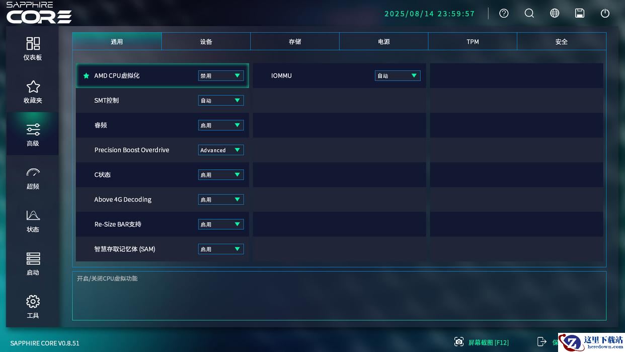收藏夹是作为全新BIOS另一个亮点,蓝宝石特意为它设计了一个独立的板块,玩家想要把某个选项放入收藏夹时,只需要在选项上用鼠标点一下或者按下F键即可,取消收藏同理,上图就是针对锐龙9000的DDR5 6000C26-35-35-58的个人作业,大家有兴趣试一下欢迎来抄。除了对超频爱好者友好之外,也方便网维、工程师针对性调整。