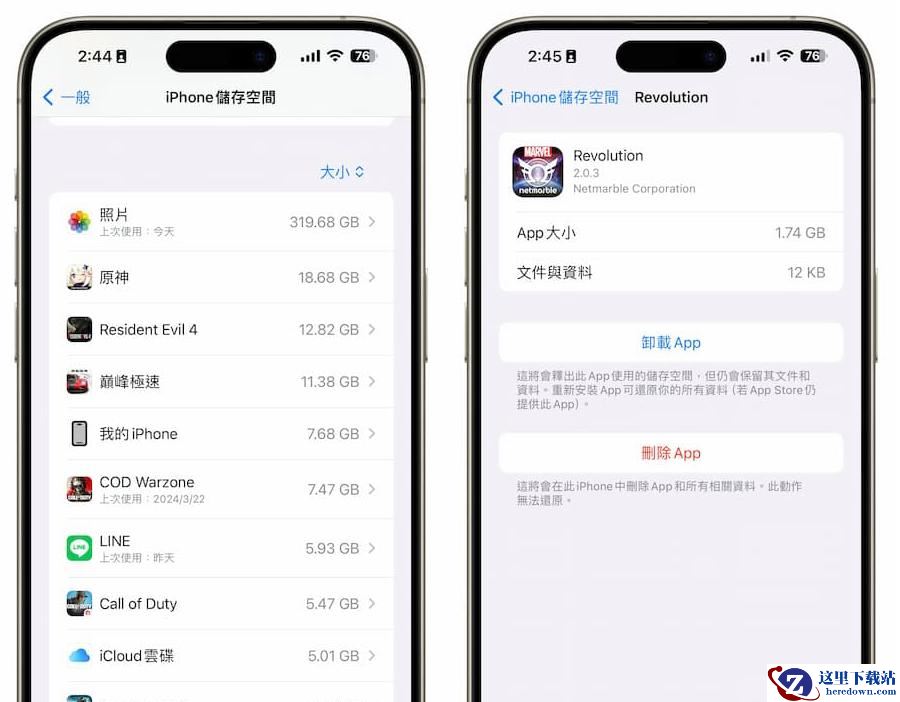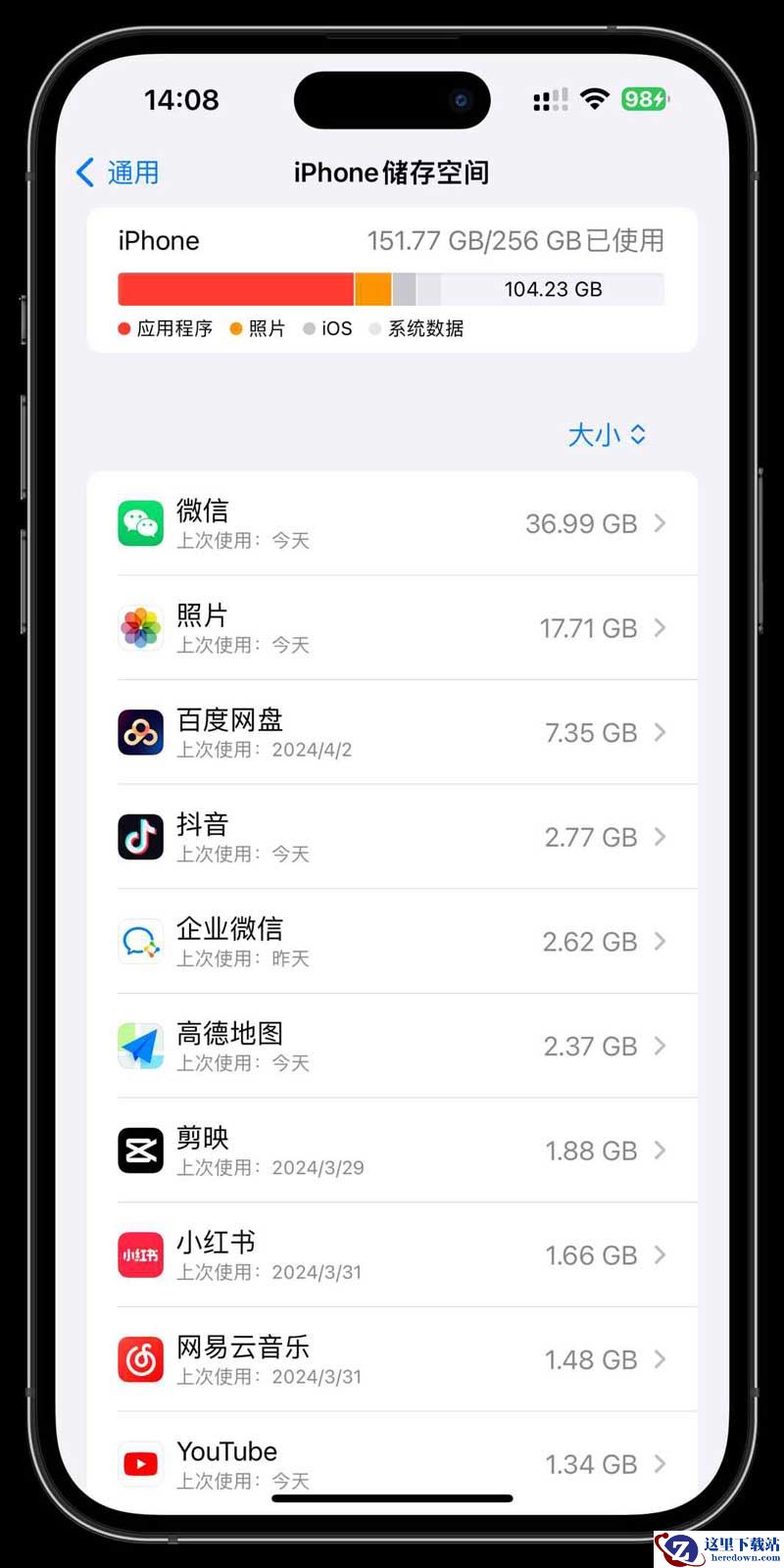 可以通过「iPhone储存空间」功能内查询,切换到「大小」排列,容量最大到最小依序下去,所以透过列表从头开始检查占用比较大容量 GB 容量的应用程序App或游戏,点进去看看是否文件与资料大于 App 太多(如原本App才几百MB,则占用GB空间就要进一步调整),考虑里面是否有重要数据要搬移到云端空间储存,并且将App删除重装。