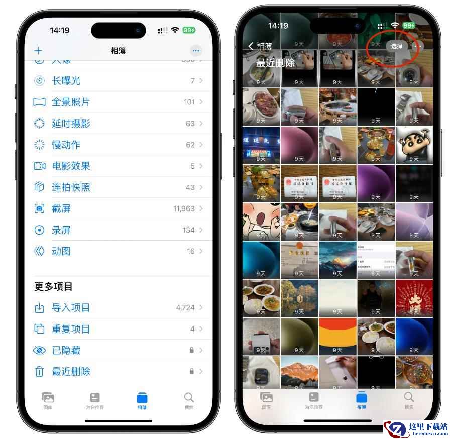 可以开启 iPhone 內建「照片」APP,从「相册」分页内点选「最近删除」功能,点右上角选取,全选照片后进行删除。
