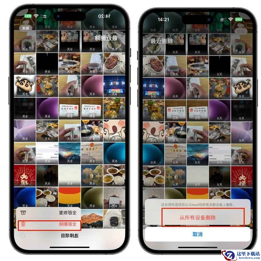接下来点选右下角「•••」三个点按钮,选择「全部删除」,按下「从此iPhone删除」就能一键清除 iPhone 相册垃圾桶内的照片、影片档案。