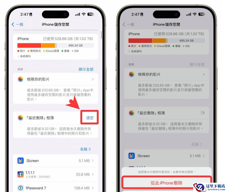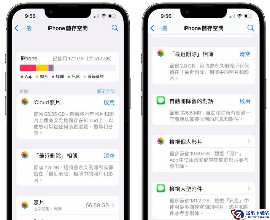 另外也可以从「iPhone储存空间」功能内,要是要最近删除的照片量太多,系统也会跳出建议提示,只要按下「清空」就会快速将保留在「最近删除」的相册照片与影片直接清掉,就能释出更多iPhone空间。