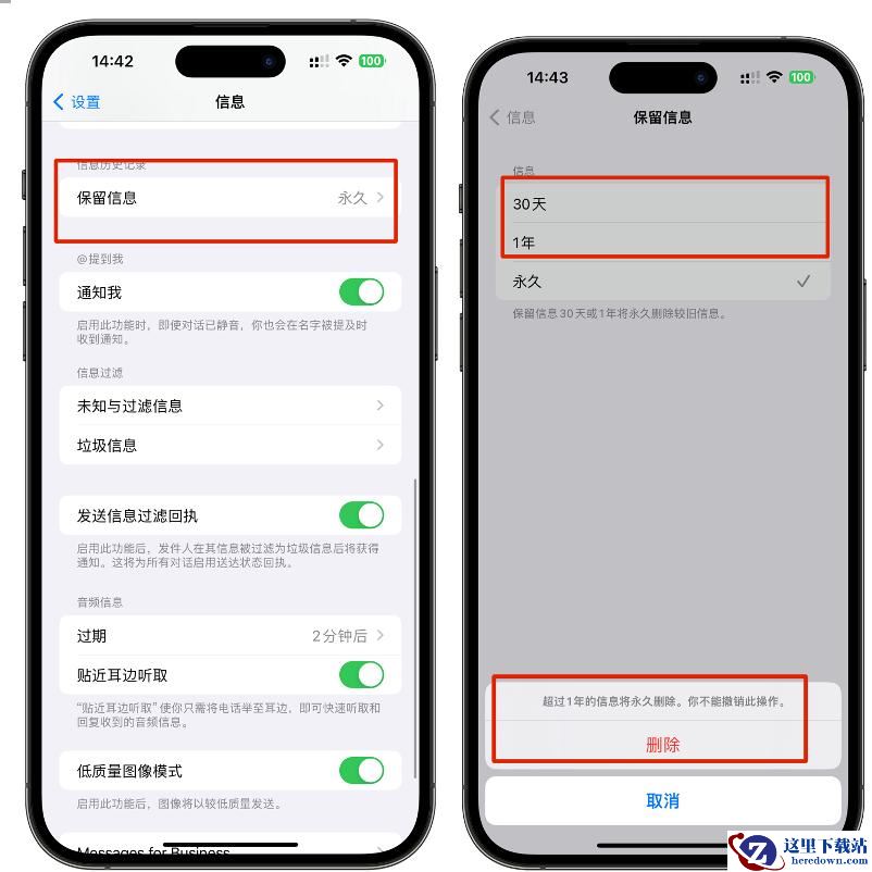 可以通过iOS「设置」>「信息」>「保留消息」内,可以改为1年、30天,让iPhone自动定时删除短信和讯息附件。