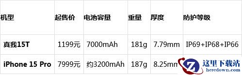 从表格对比可以看出,真我15T在电池容量、防护等级和厚度方面都优于iPhone 15 Pro,而价格仅为后者的15%。