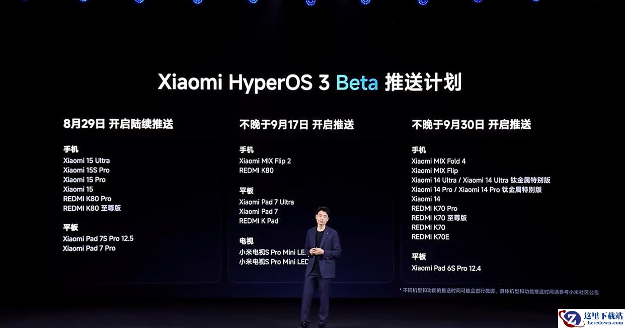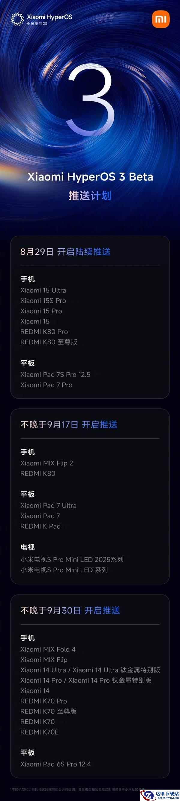 小米MIX Flip 2、REDMI K80、小米平板7 Ultra、小米平板7、REDMI K Pad、小米电视S Pro Mini LED 2025系列、小米电视S Pro Mini LED系列。不晚于9月30日开启推送