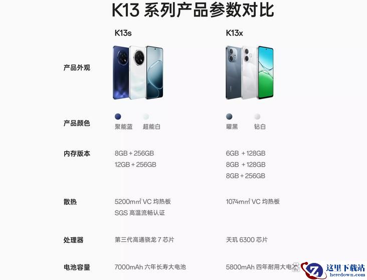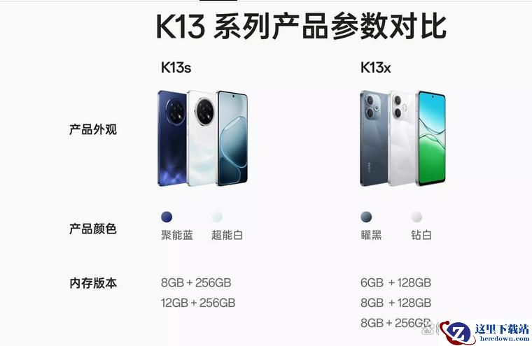 存储方面,K13s提供8+256GB和12+256GB版本,配备LPDDR4X内存与UFS 3.1闪存。K13x则提供6+128GB、8+128GB与8+256GB版本,配备LPDDR4X内存与UFS 2.2闪存。