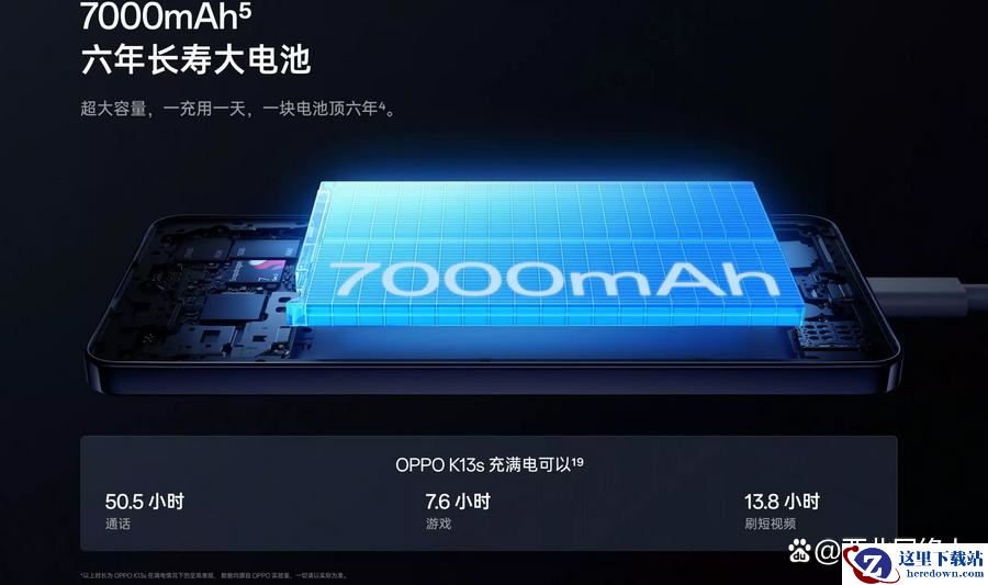 K13s内置了一块7000mAh的超大容量电池,搭配80W超级闪充。官方数据显示其最高通话时长可达50.5小时。这电池容量,在智能手机里绝对是第一梯队了,重度使用一天应该毫无压力。