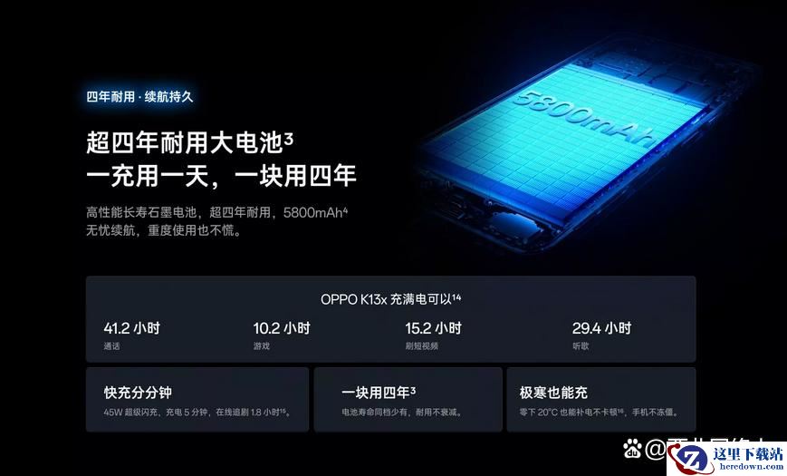K13x则内置了5800mAh的长寿石墨电池,通话时长最高可达41.2小时,搭配45W超级闪充。5800mAh虽然比OPPO K13s的7000mAh小一些,但在这个价位也是非常大的容量了,日常使用坚持一天绰绰有余。