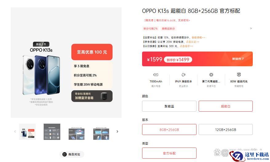 OPPO K13s共提供有超能白和聚能蓝两款配色,具体内存配置和售价如下: