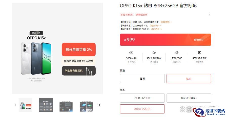 8+256GB:1499元12+256GB:1799元OPPO K13x共提供有曜黑和钻白蓝两款配色,具体内存配置和售价如下: