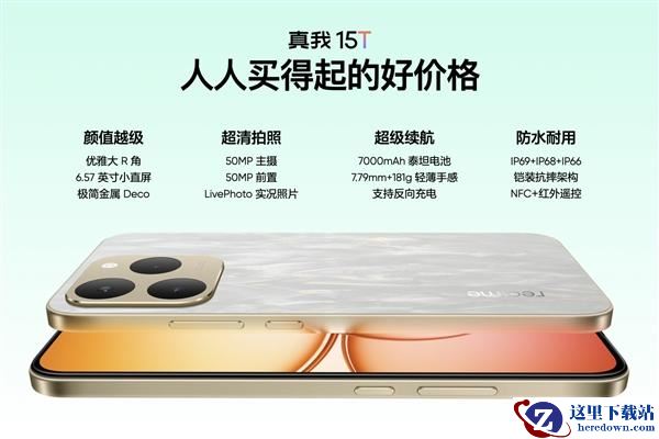 真我15T配备真我15系列同款7000mAh泰坦电池,同时将厚度控制在7.79mm,重量仅为181g,搭载联发科天玑6400 Max处理器,前置5000万像素,后置5000万像素,配备60W超级闪充,支持5W反向充电,同时拥有IP69满级防水、铠装抗摔架构、360°NFC、万能红外遥控等功能。