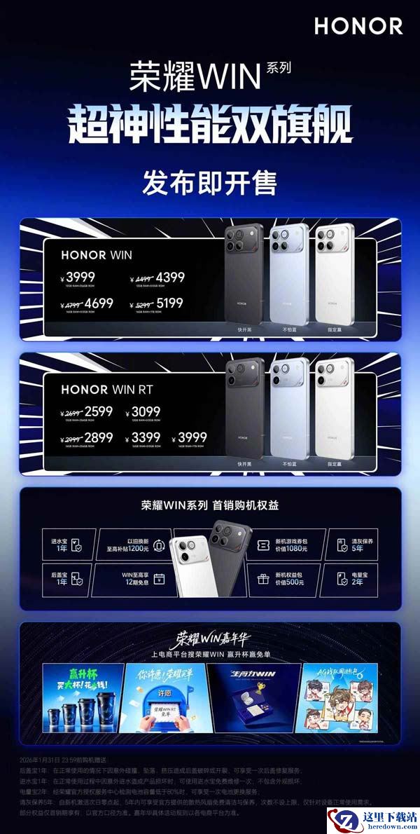 作者:本站作者 人气:12月26日,荣耀正式发布全新电竞旗舰系列——荣耀WIN,包含WIN与WIN RT两款机型,起售价分别为3999元与2699元。该系列以“年度电竞夯机”为定位,在核心硬件、散热架构、续航能力、屏幕素质及生态联动等方面进行了体系化升级