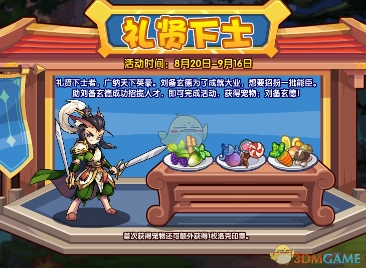8月20日 -9月16日参与【礼贤下士】活动,助刘备玄德成功招揽人才获取宠物刘备玄德。