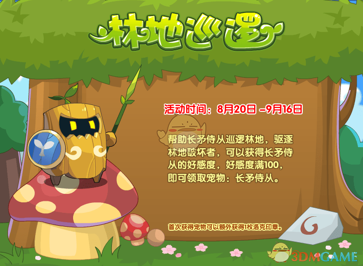 帮助长矛侍从巡逻林地,驱逐林地破坏者,可以获得长矛侍从的好感度,好感度满100,即可领取宠物:长矛侍从。