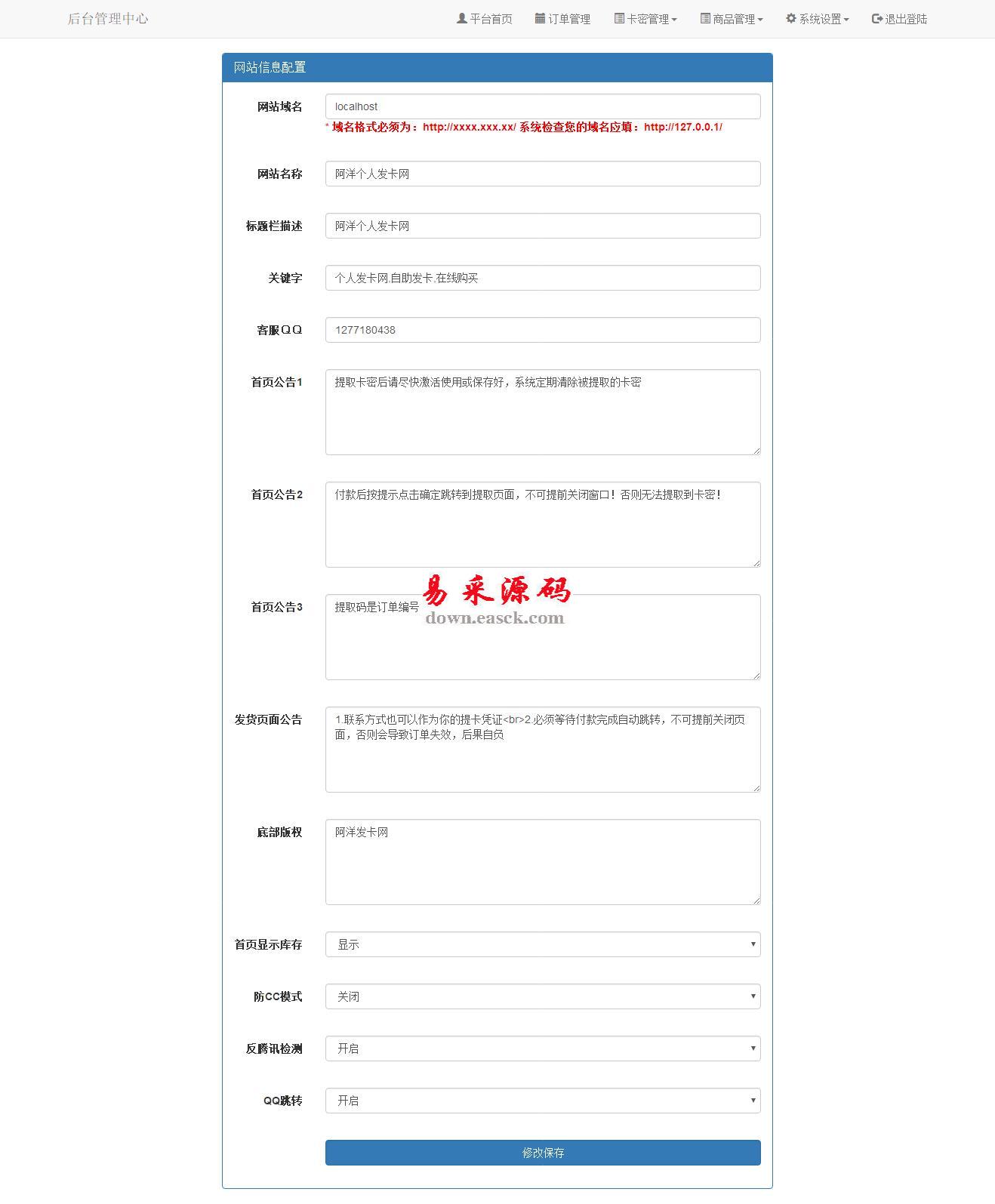 自动发卡平台源码 v2.0 1014 KB107人下载该软件是一个以php+MySQL进行开发的个人版自动发卡网站源码。网站功能:1、支付接口2、换购率设置3、商品管理4、订单管理5、smtp设置6、修改密码使用说明:自动发卡平台源码可以放入任何站点安装徐大大个人自动发卡平台http://您的域名/install.php后台地址ht