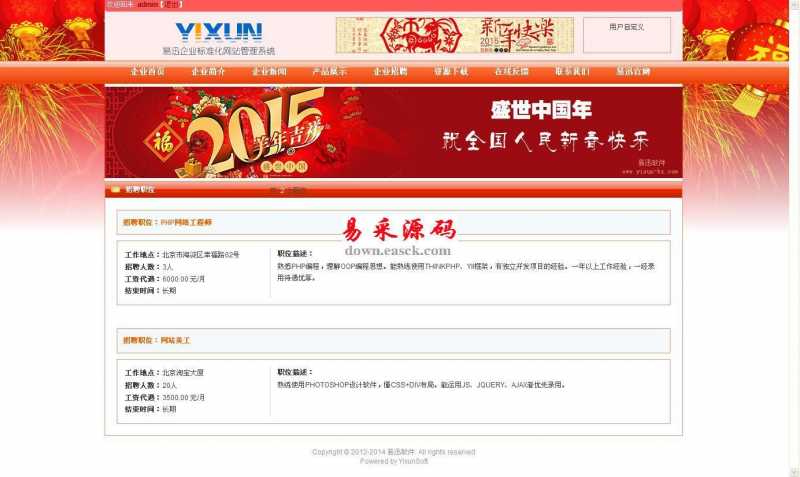 YIXUNCMS网站建设系统 v2.0.4.3 增强版 3.98 MB109人下载YIXUNCMS网站建设系统是由易迅软件工作室专为中小型企业开发的一套展示类网站系统,采用目前流行的PHP语言并搭配性能稳定的MYSQL数据库。系统特点:1.采用目前流行的PHP语言编写,底层采用超轻量级框架作为系统支撑;2.页面布局使用DIV+CSS技术,遵循WEB标准