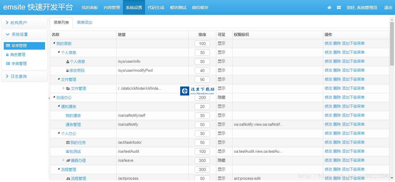 4、菜单管理:配置系统菜单,操作权限,按钮权限标识等。