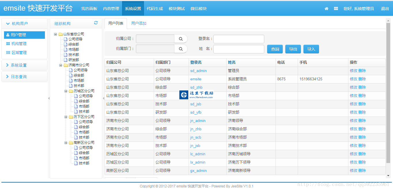 2、机构管理:配置系统组织机构(公司、部门、小组),树结构展现,可随意调整上下级。