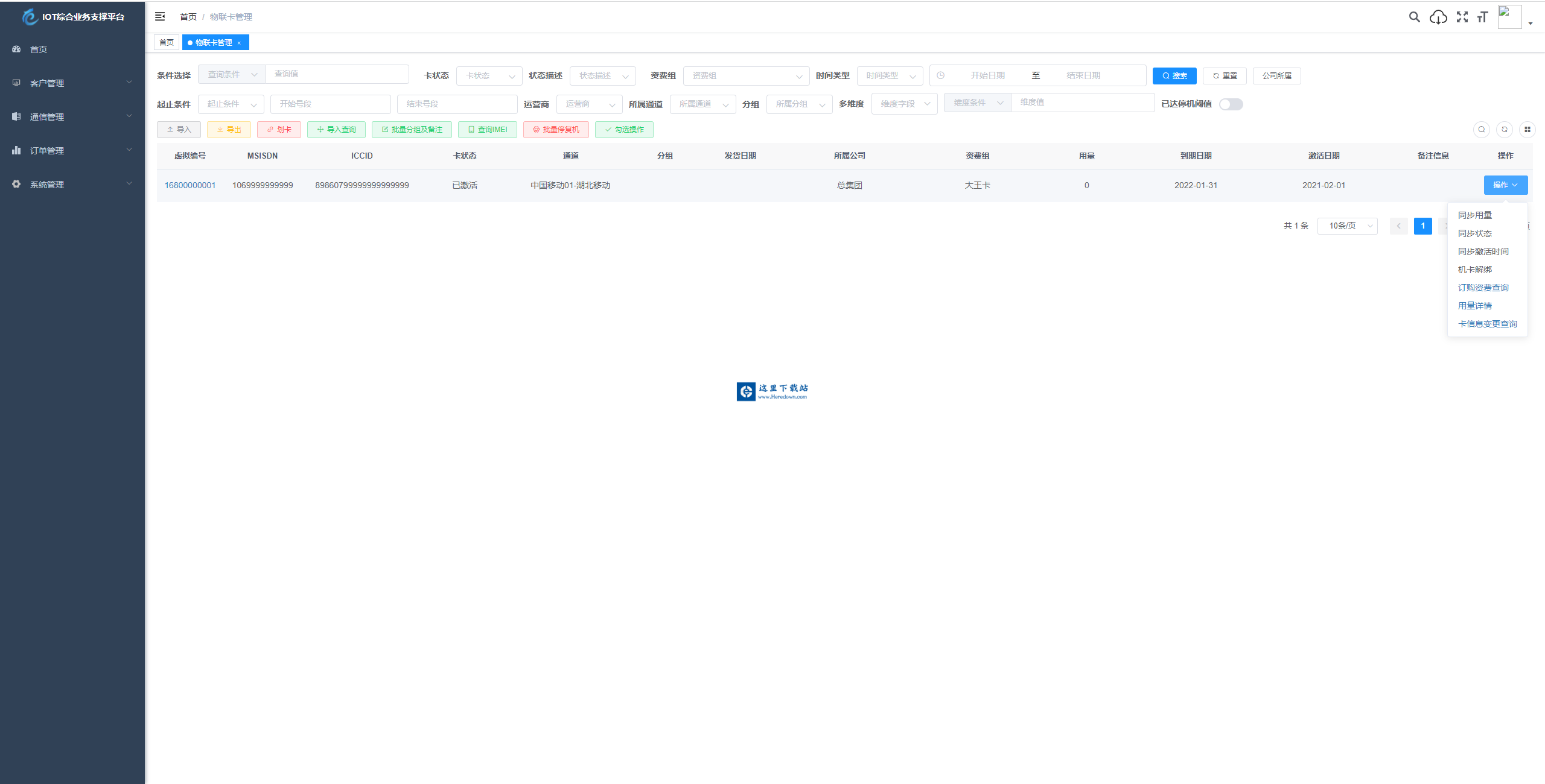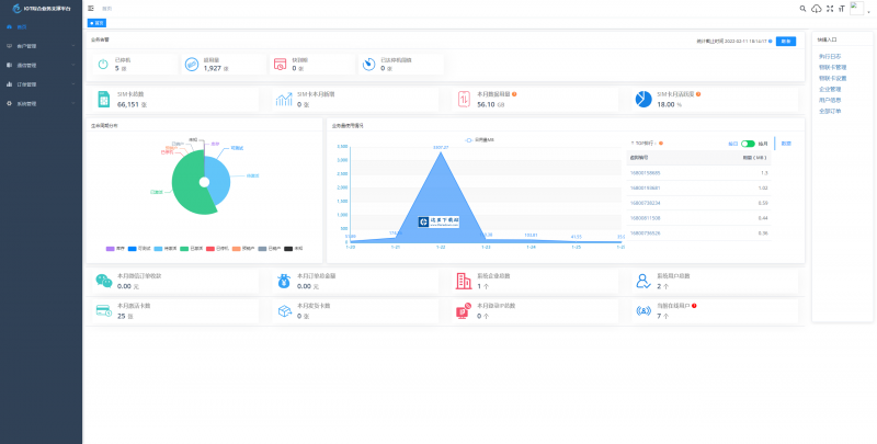 管理物联卡 用量记录、套餐封装、在线信息获取、智能诊断、分组备注、企业代理管理、预存、充值、返利 等。