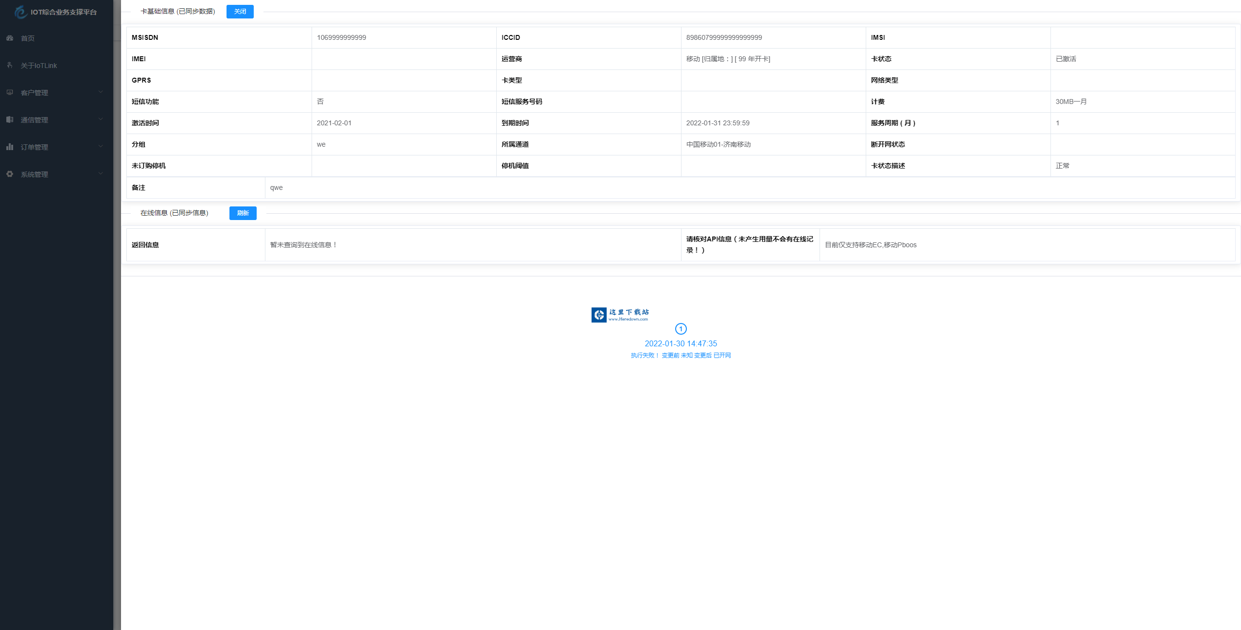 IoTLink是一个基于 SpringBoot、Vue、Mybatis、RabbitMq、Mysql、Redis 等开发的轻量级的物联网综合业务支撑平台。支持物联网卡、物联网模组、卡+模组融合管理。提供状态、资费、客户、进销存、合同、订单、续费、充值、诊断、账单等功能。平台可同时接入中国移动、中国电信、中国联通、第三方物联网卡进行统一管理。逐步完善平台,助您快速接入物联网,让万物互联更简单。