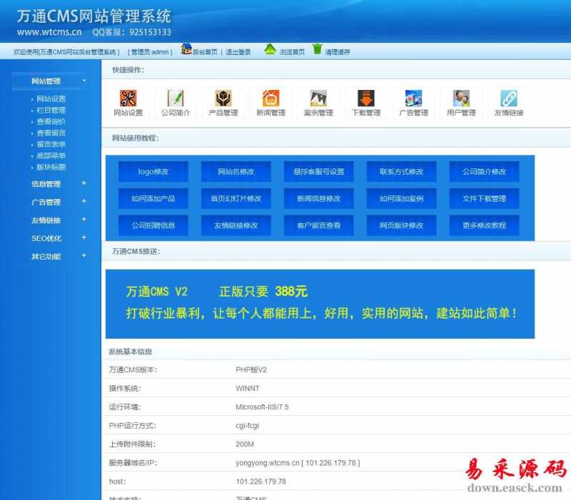 万通CMS企业网站系统 v2.2.123.34 MB105人下载万通CMS网站管理系统采用PHP+MYSQL技术,支持伪静态功能,可生成google和百度地图,支持自定义url、关键字和描述,利于SEO搜索。拥有企业网站常用的模块功能(企业简介功能、新闻功能、