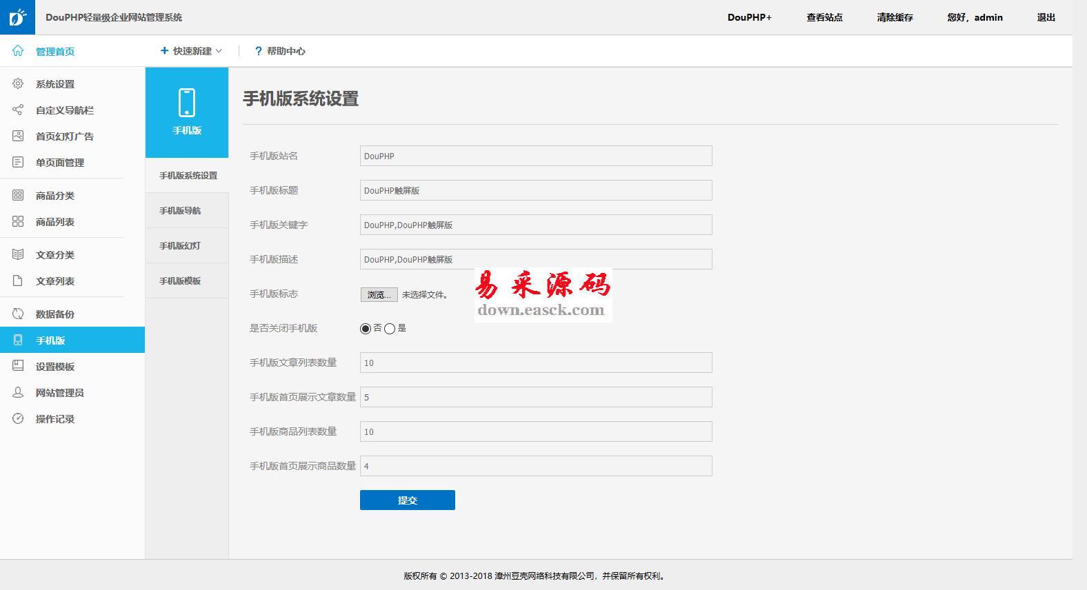 DouPHP轻量级企业网站管理系统 v1.3 Release 20170424DouPHP 是一款轻量级企业网站管理系统,基于PHP+Mysql架构的,可运行在Linux、Windows、MacOSX、Solaris等各种平台上,系统搭载Smarty模板引擎,支持自定义伪静态,前台模板采用DIV+CSS设计,后台界面设计简洁明了,功能简单易具有良好的用户体验,稳定性好、扩展性及安全性强,可通过后台在线安装模块,比如会员模块、订单模块等,可面向中小型站点提供网站建设解决方案。