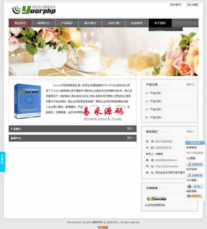 YIXUNCMS网站建设系统 v2.0.4.3 增强版 3.98 MB109人下载YIXUNCMS网站建设系统是由易迅软件工作室专为中小型企业开发的一套展示类网站系统,采用目前流行的PHP语言并搭配性能稳定的MYSQL数据库。系统特点:1.采用目前流行的PHP语言编写,底层采用超轻量级框架作为系统支撑;2.页面布局使用DIV+CSS技术,遵循WEB标准