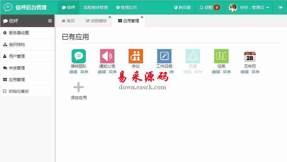 信呼协同办公系统 v1.1.6 2.95 MB102人下载信呼协同办公系统是开源的一款办公系统,跨平台的系统,支持APP,pc网页版,pc客户端等。 简介: 1、让每个企业单位都有自己的工作系统。 2、移动,免费开源工作系统,数据全部自己管理。 3、自定义管理应用,模块数据,权限分配。 4、单据快速提醒推送,重要