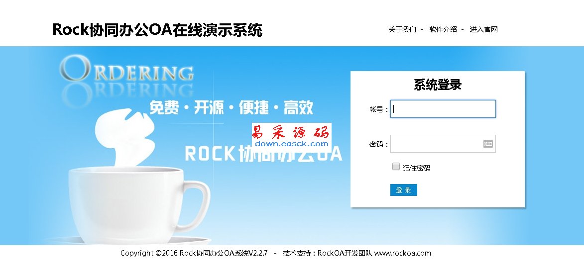 RockOA协同办公OA系统 v2.3.2 7.23 MB189人下载RockOA是一款开源OA办公系统,让每个企业都有属于自己的OA办公系统。 RockOA办公系统是适用于中小型企业的通用型协同OA管理软件,融合了长期从事管理软件开发的丰富经验与先进技术,该系统采用领先的B/S(浏览器/服务器)操作方式,使得网络办公不受地域限制。