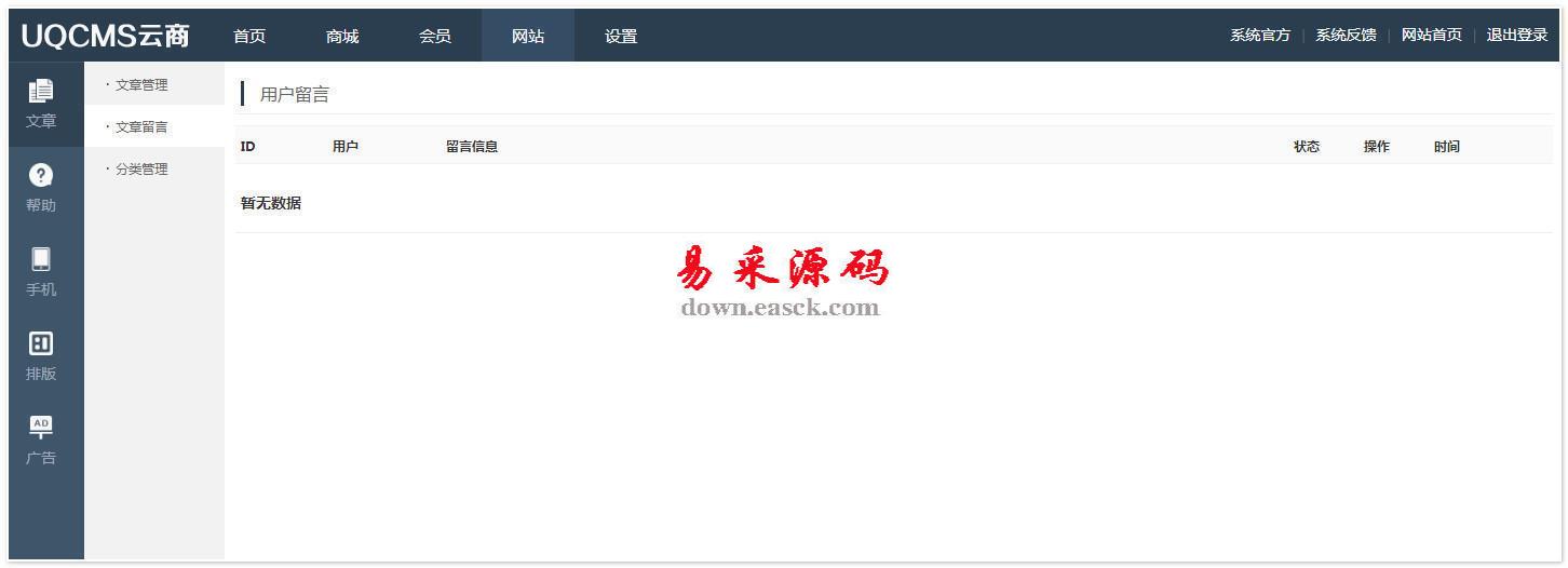 后端配置 > 后端配置 > 商店信息 站点配置 > 站点设置 > 基础配置 > 用户注册 > 用户登录 > 密码找回 > 附件 > 图片验证码 > 订单售后 > 短信设置 > 短信设置 > 消息模板 > 邮箱设置 > 邮箱设置 > 消息模板 > SEO设置 > 协议管理 > 用户注册协议 权限控制 > 管理员列表 > 角色管理 > 权限分配 用户管理 > 用户管理 商品管理 > 商品管理 > 商品分类 > 商品评论 订单管理 > 订单管理 > 订单售后 问答留言 > 问答留言 网站管理 > 导航管理 > 中间导航 > 底部导航 > 自定义页面 > 友情链接 > 主题管理 > 当前主题 > 主题安装 > 首页轮播 > 筛选价格 > 地区管理 > 快递管理 > 支付方式 品牌管理 > 品牌管理 > 品牌分类 手机端管理 > 基础配置 > 首页导航 支付宝小程序 > 基础配置 > 小程序源码包 微信小程序 > 基础配置 > 小程序源码包 百度小程序 > 基础配置 > 小程序源码包 支付宝生活号(仅v1.1.0版本有,后续版本已移除) > 生活号管理 > 生活号分类 > 消息管理 > 菜单管理 > 批量上下架 > 用户管理 文章管理 > 文章管理 > 文章分类 数据管理 > 消息管理 > 支付日志 > 退款日志 > 积分日志 应用中心 > 应用管理 > 应用管理 > 上传安装 > 应用商店(你意想不到的功能插件都在这里) 工具 > 缓存管理 > SQL控制台