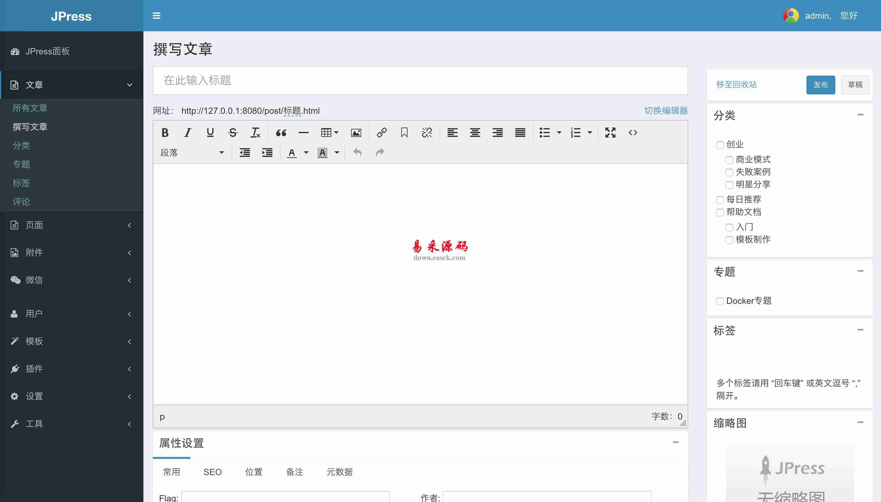 JPress v0.2 bulid0706 6.13 MB107人下载JPress,一个wordpress的java代替版本,使用JFinal开发。支持类似wordpress的几乎所有功能,比如:模板,插件等。同时在模板上,JPress提出了模板即模型的概念,方便模板制作人灵活制作业务模型,移除了widget等繁杂功能,同时在模板和插件制作上比wordpress