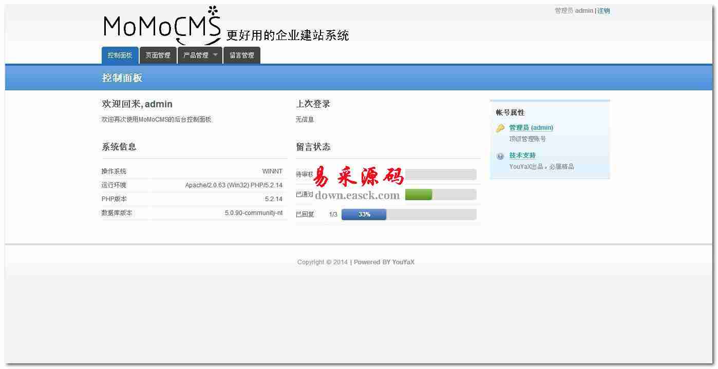 MetInfo企业网站管理系统 v5.3.4 14.89 MB123人下载MetInfo 企业网站管理系统,完美实现电脑网站+手机网站+微信公众号三位网络入口为一体的php企业网站管理系统。利用一个后台,就能够便捷的管理电脑网站、手机网站、微信公众号,信息内容都可以一致同步推送。微信公众号管理系统让你无需支付任何费用就可以使